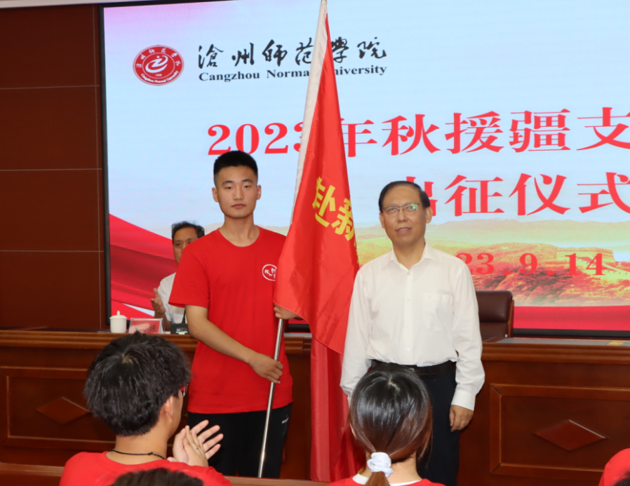 千里援疆担使命,接力前行谱新篇。9月14日下午,沧州师范学院2023年秋季援疆支教学生出征仪式在齐越楼四楼会议室举行。61名学生即将奔赴新疆轮台,用实际行动践行志愿精神,在奉献中绽放青春光彩。校长张占平出席仪式并为支教小分队授旗,党委常委、副校长范小振代表学校讲话,党委常委、副校长高颖主持仪式。
