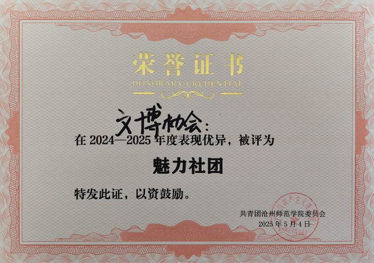 文博协会连续三年获得“魅力社团”荣誉称号,荣获“2024年度全市先进科普基地”荣誉称号,社团内的优秀成员也先后获得第十届“全国高校大学生家史大赛”三等奖,第二届全国大学生职业生涯规划大赛校赛金奖、铜奖等。目前,社团指导老师韩梦瑶正在带领社团成员积极探索社会科学发展研究的新兴课题,例如《AI赋能大运河非遗文创助推沧州文旅——吴桥杂技纹样提取与再利用》、《数字技术在大学生文化创意产品生成中的应用研究》等课题均已立项,相信不久也将是社团荣誉中浓墨重彩的一笔。